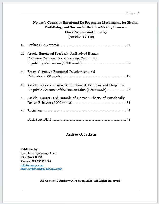 I can rationalize how a paper I wrote outlining the existence of “… a system inherent in all of us that is physiologically geared to process information to a state of mental health” (Shapiro, 2018, p. 14) (and had it professionally edited) was rejected by two peer-review journals…. maybe. I had no empirical evidentiary research. But, my paper was for discussion and to bring up arguments for re-evaluation and research into the concept of emotional dysfunction and emotional control, regulation, and management (even with the use of pharmaceuticals) and how this universally accepted ideology is self-contradictory literary theory with limited scientific discovery inscribed by Homer in his “Iliad” 3000 year ago. I rewrote my technical paper into a broader, more inclusive format and included the “Dangers, Hazards, and Liabilities of Homer’s theory of Emotionally Driven Behavior”: Reference: Jackson, A.O. (2026). (Technical Paper with Supplements.) Cognitive-Emotional Re-Processing Control, Cultivation, and Education: The Linguistic Semantics of Cognitive vs. Emotional Dysregulation. Symbiotic Psychology Press. (15,500-word paper, free PDF download, new tab)