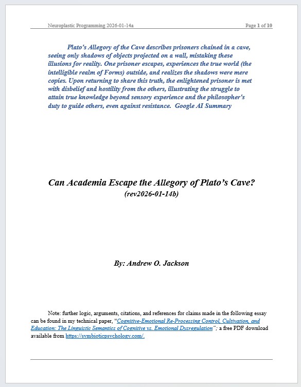 Our primary and secondary school teachers are indoctrinating their students (and future academics) with an geocentric psychology of emotionally driven behavior that sabotages our children’s natural cognitive-emotional re-processing mechanisms that have evolved to guide one’s own cognitive behavior (such as thoughts, imaginings, reasoning, etc.) towards health, well-being and successful and effective decision-making and their actualization (reference: Reference: Jackson, A.O. (2026). (Technical Paper with Supplements.) Cognitive-Emotional Re-Processing Control, Cultivation, and Education: The Linguistic Semantics of Cognitive vs. Emotional Dysregulation. Symbiotic Psychology Press. (15,500-word paper, free PDF download, new tab)