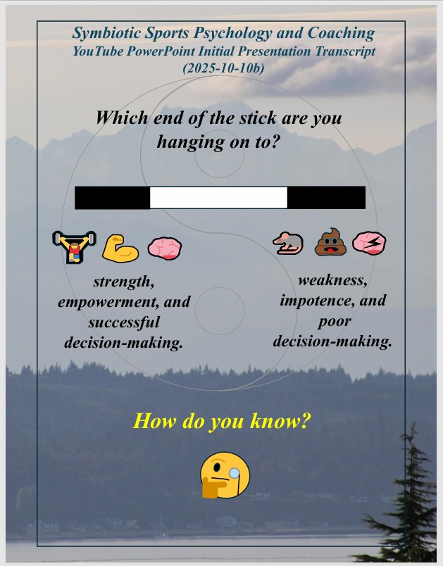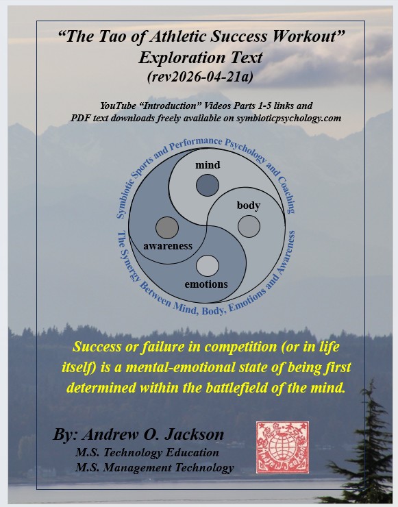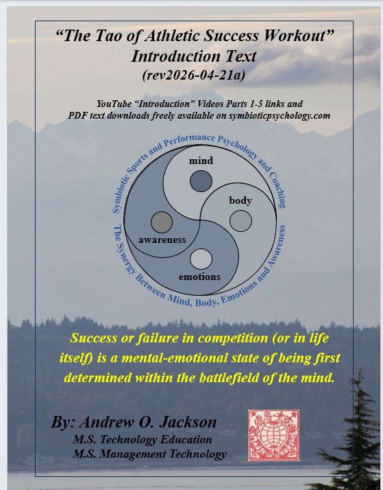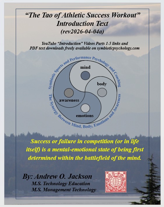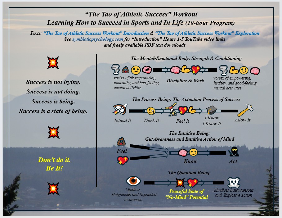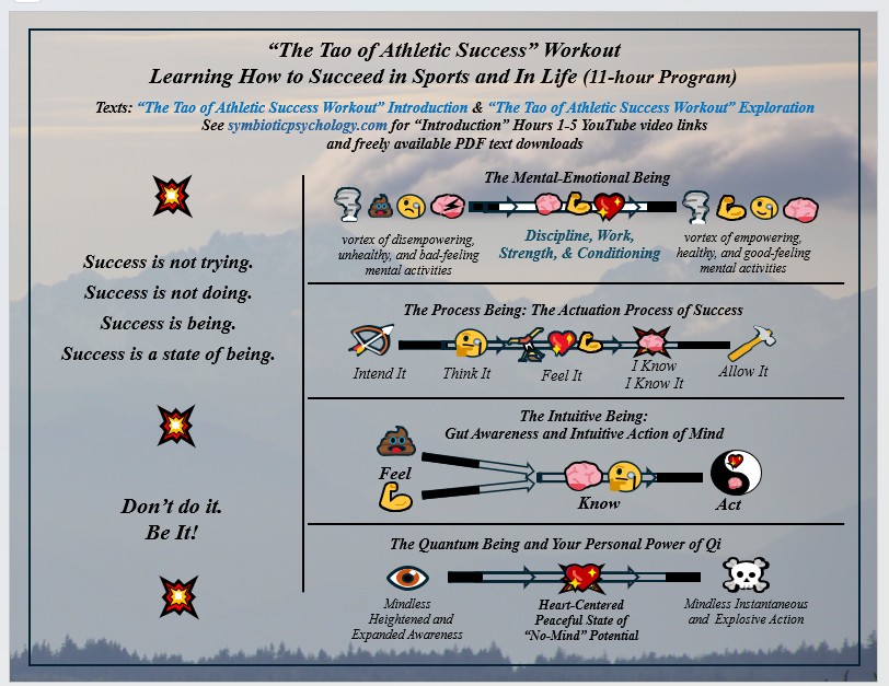 “The Tao of Athletic Success Workout” (immediately below) is a new sports performance psychology based on millions of years of evolutionary survival of the fittest, strongest, most agile and most powerful and clever and their evolved symbiotic harmony of mind, body, emotions, and awareness within a personal power of Qi. “The Tao of Athletic Success Workout” is a freely available self-directed 10-hour program with “Introduction” Videos for hours 1-5 available on YouTube. Hours 6-10 are a freely available instructional, fill-in-the-blank “Exploration” text that further develops an athlete’s skills, abilities, and understandings of their “Quantum Being” nature beyond their Newtonian linear time and 3D spacial awareness, strengths, and power.