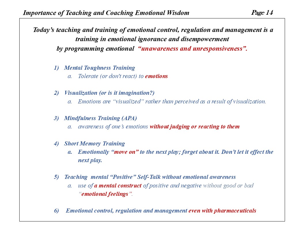 A character may be emotionally driven in a book, movie, opera, play, song, or video, but in science emotions do not drive behavior. Cognition, not emotion, precipitates the changes and states of neurological, biochemical, and physiological being in the brain and body that drives behavior. Emotions are the perception of these changes and states of physiological being. This is the evolved cognitive-emotional foundation within humanity that allows well researched and evidenced based cognitive behavior modification therapies to work and to be successful. Teachers in academic education (language, literature, psychology, sociology, philosophy, and law) and coaches (athletics and sports) can and must work together in developing a student’s cognitive-emotional dynamics that are in harmony with their evolutionary heritage of strength, speed, stamina, agility, cunning, health, well-being, and successful decision-making prowess and ability.